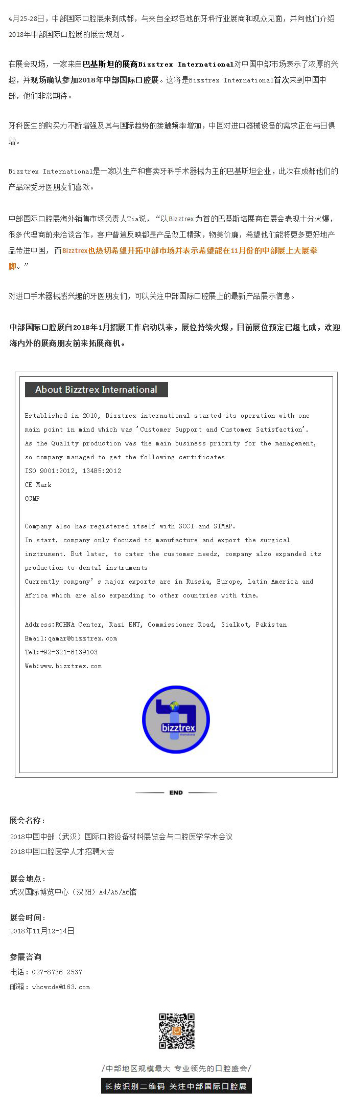 巴基斯坦展商Bizztrex International确认参加2018年中部国际口腔展