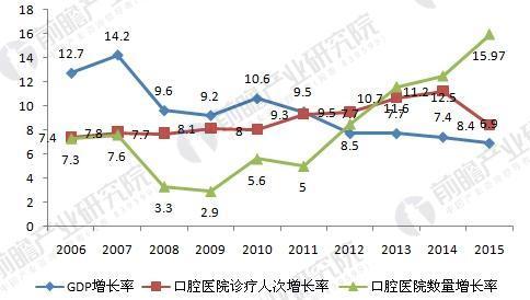 2006-2015年口腔医院数量、诊疗人次及GDP增长率对比(单位:%)