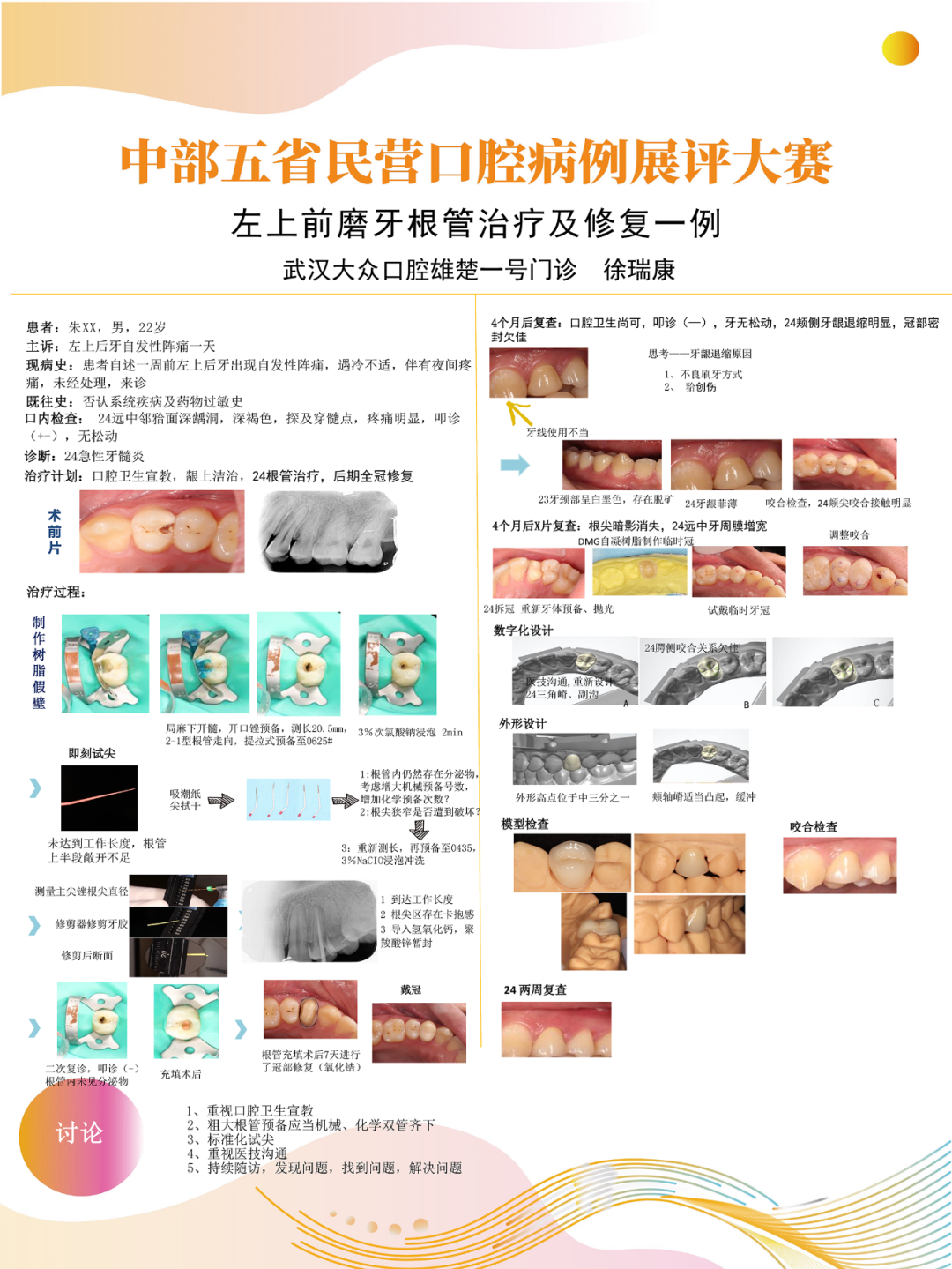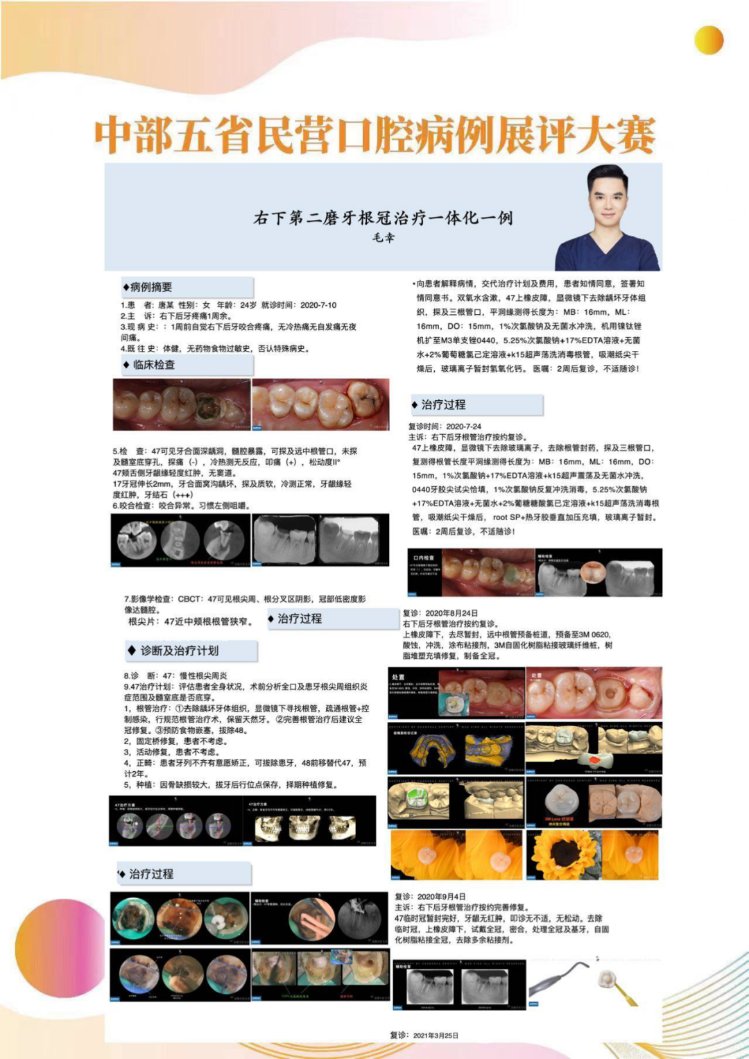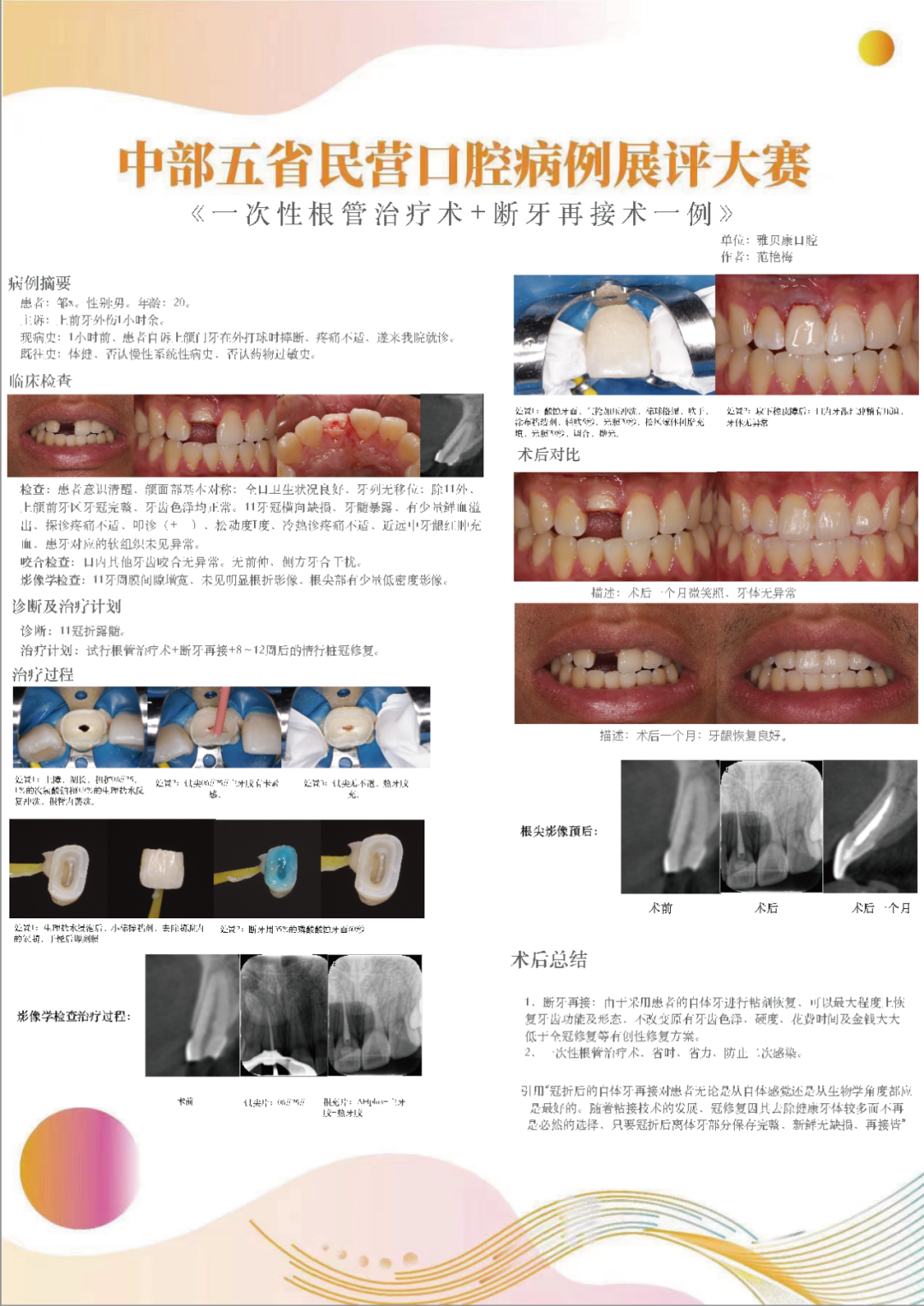 聚焦中部五省民营口腔优秀病例,促进中部民营口腔医师学习交流。2023年11月25日,中部五省民营口腔联盟在2023中部国际口腔展上正式成立,并在现场举办了优秀病例交流活动决赛。决赛中众多优秀病例脱颖而出,荣获嘉奖。本期跟大家分享的是牙体牙髓组其中13位获奖作者的作品,欢迎大家共同交流学习! 长按识别二维码 关注中部国际口腔展