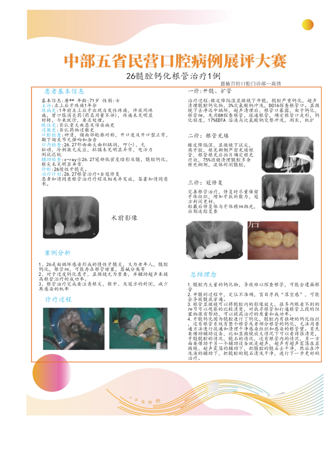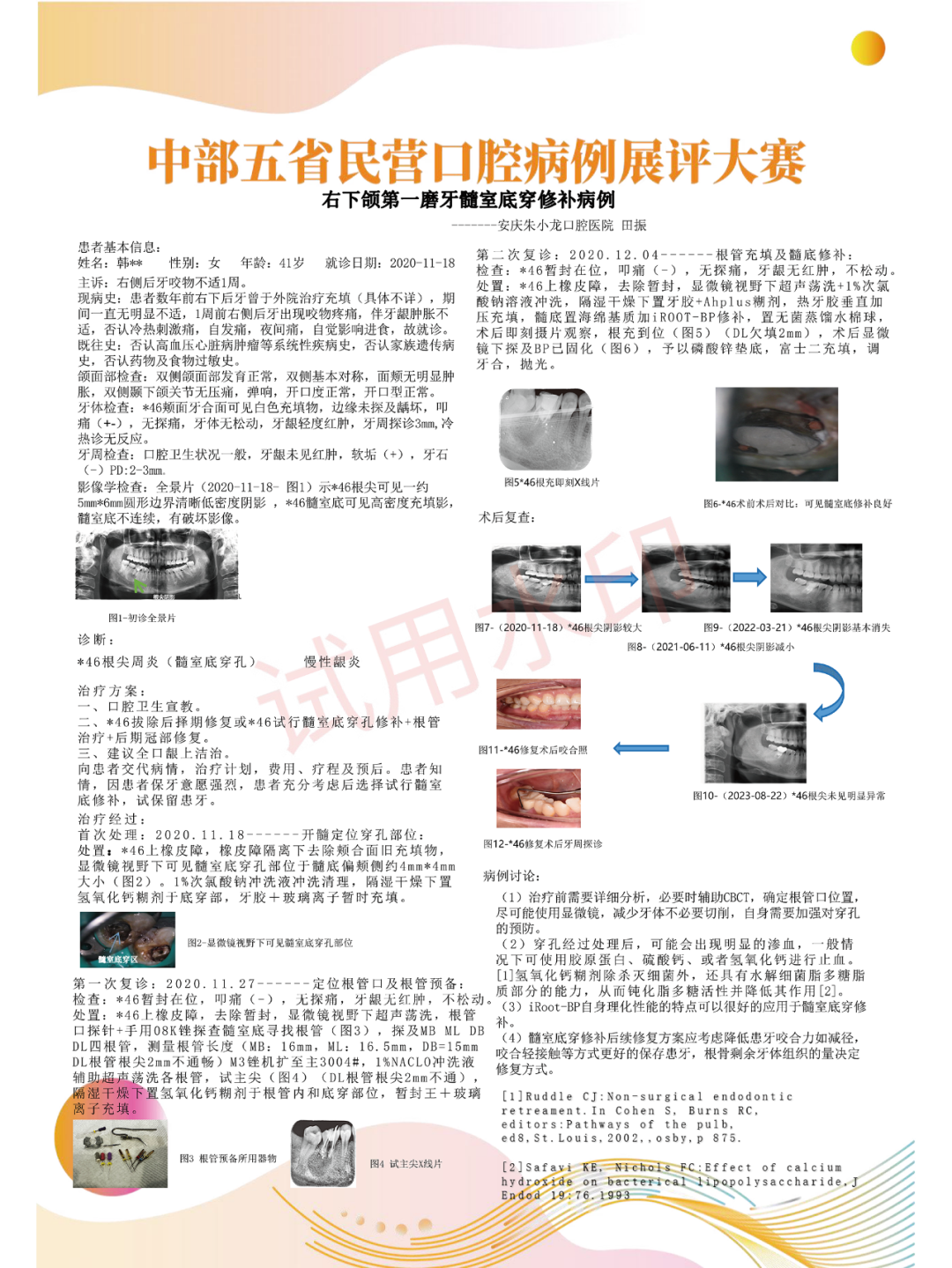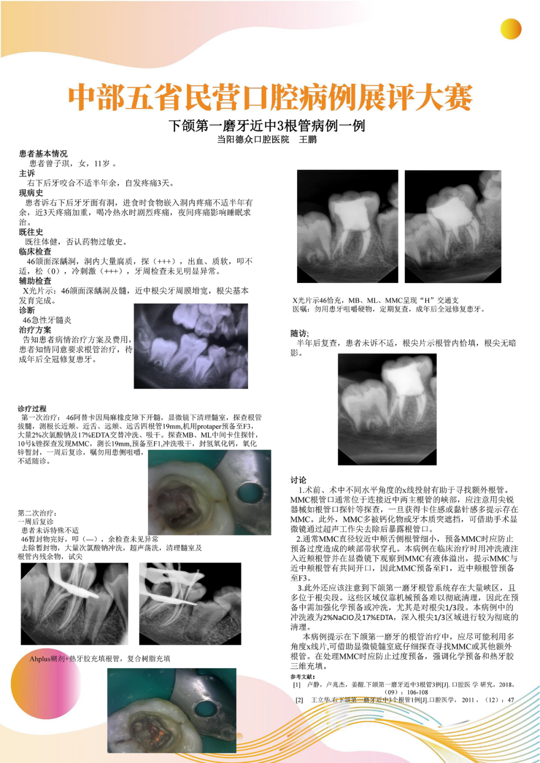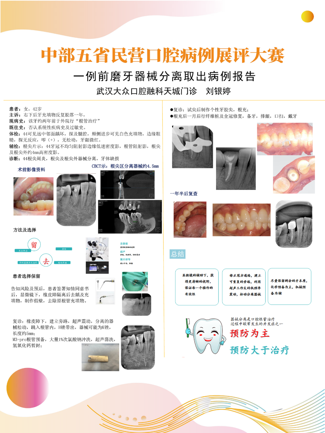 聚焦中部五省民营口腔优秀病例,促进中部民营口腔医师学习交流。2023年11月25日,中部五省民营口腔联盟在2023中部国际口腔展上正式成立,并在现场举办了优秀病例交流活动决赛。决赛中众多优秀病例脱颖而出,荣获嘉奖。本期跟大家分享的是牙体牙髓组其中13位获奖作者的作品,欢迎大家共同交流学习! 长按识别二维码 关注中部国际口腔展