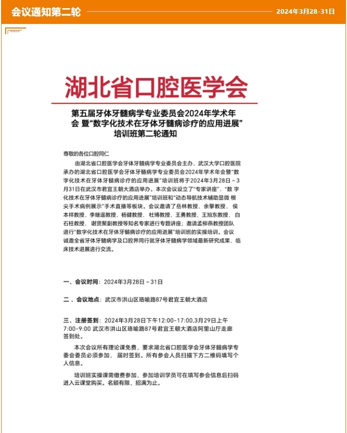 第五届牙体牙髓病学专业委员会2024年学术年会暨“数字化技术在牙体牙髓病诊疗的应用进展”培训班第二轮通知